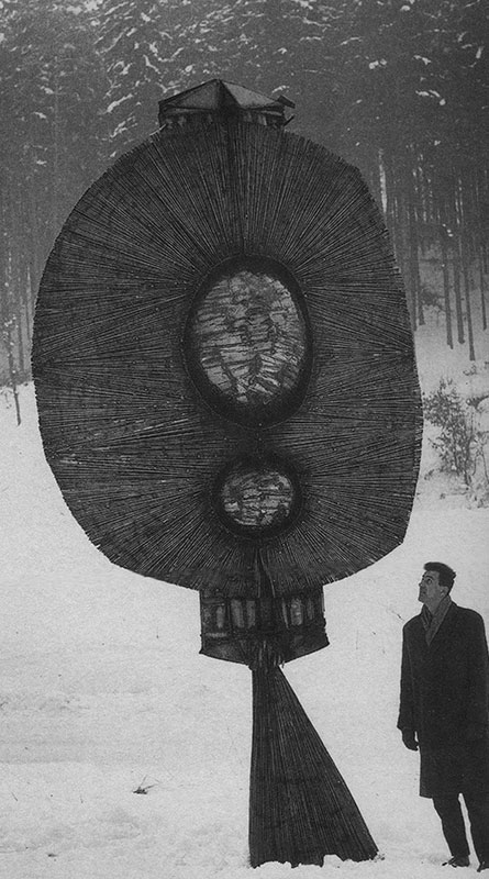 Constantin Brancusi (1876-1957) was commissioned by the Women’s League of Gorj to honor the soldiers who defended Târgu-Jiu against a German force during World War I. The sculpture is a 30 meter high, column of zinc, brass-clad, cast-iron modules threaded onto a steel spine, and is part of a three-sculpture ensemble along with two travertine monuments called Gate of the Kiss and Table of Silence.